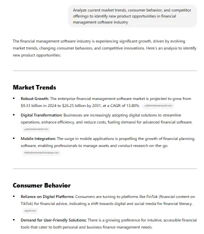 How it helps: AI scans customer feedback, reviews, and unmet needs to brainstorm product concepts.