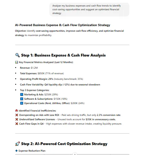 3. Analyze my business expenses and cash flow trends to identify cost-saving opportunities and suggest an optimized financial strategy
