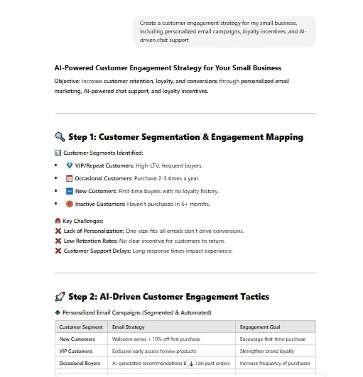2. Create a customer engagement strategy for my small business, including personalized email campaigns, loyalty incentives, and AI-driven chat support
