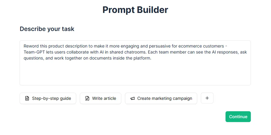 I can build a prompt based on my exact needs, whether that’s rewording a paragraph, adjusting tone, or targeting specific audiences, and then fine-tune the output. Additionally, Team-GPT makes it easy to collaborate with teammates and refine the prompts over time to create better content, making it an excellent tool for teams.