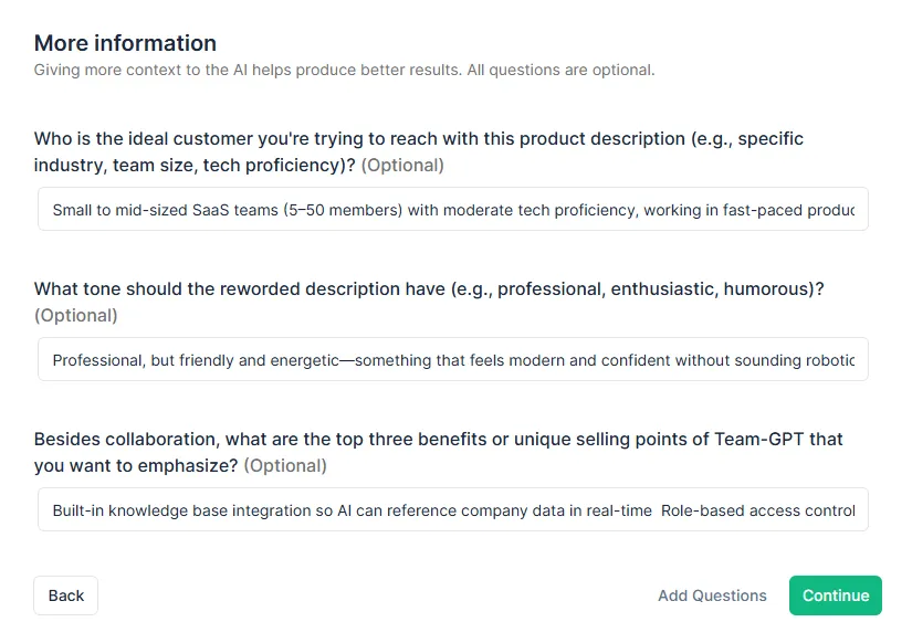 Team-GPT’s prompt builder then asks me follow-up questions to refine my request, such as: