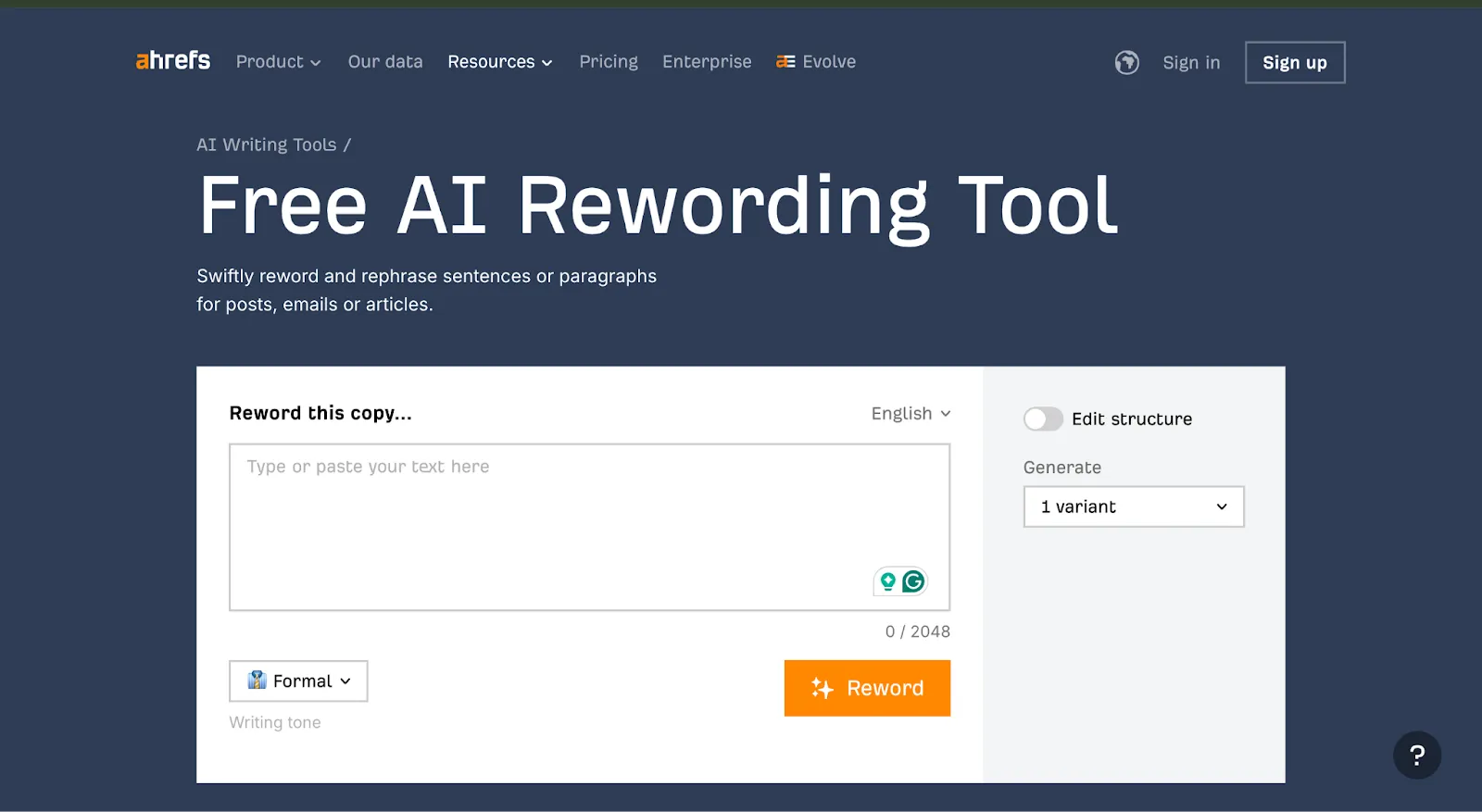 Pricing: Free to use with a daily limit of three rewordings. For unlimited access, you can explore Semrush’s premium plans, starting at $60 per month.
