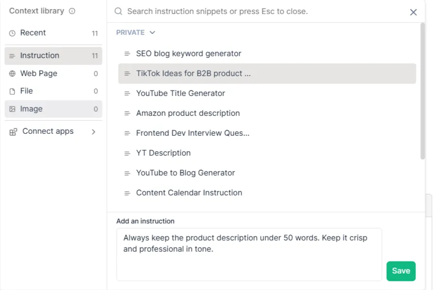 Here’s how I do it: I click on “Add Context” > “Instruction” > “Add an Instruction” > “Save.” I will name it something like “Product Description Instructions.”