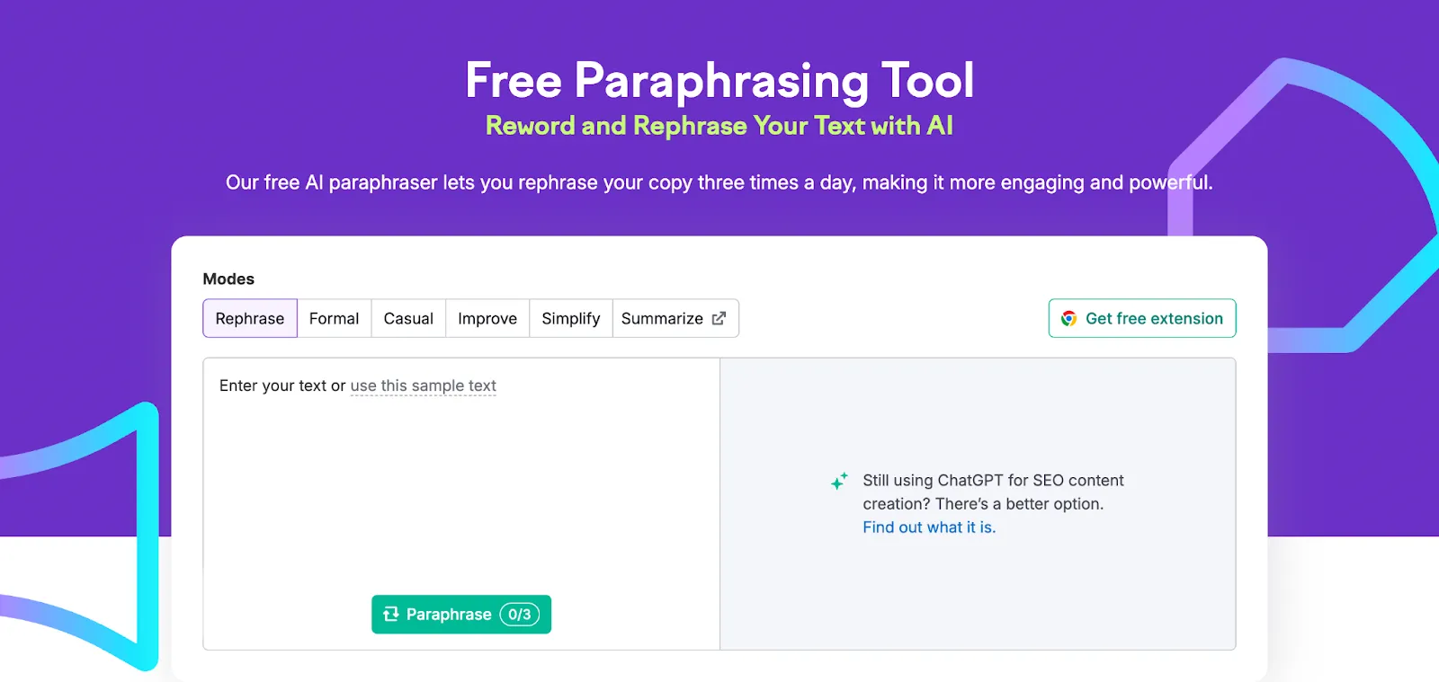 Semrush’s AI-powered Paraphrasing Tool is a free and efficient solution for anyone who needs to quickly rephrase or reword content. This tool is designed to generate high-quality, unique versions of your text while maintaining the original meaning.