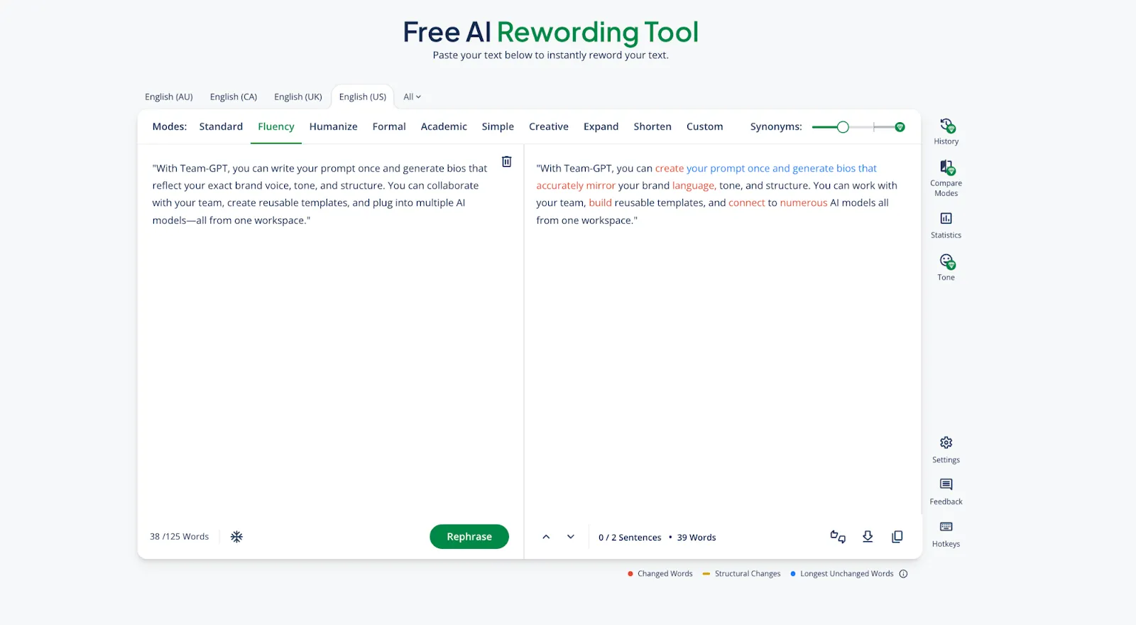 - The best AI rewording tool on the market is Team-GPT because it offers customizable prompts to get the best output and real-time collaboration with your team.