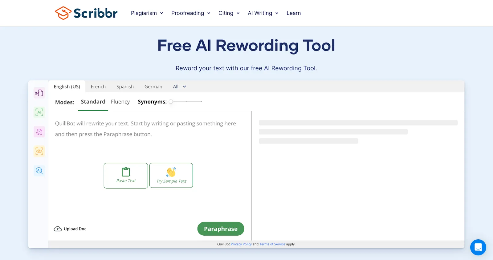 - Reword: Once I click the button, Scribbr instantly rephrases the text in seconds.
