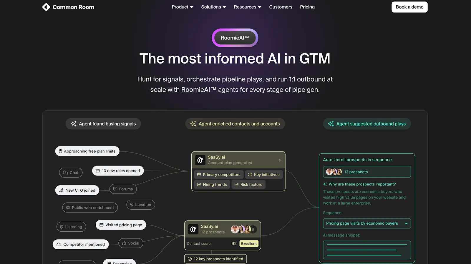 Common Room stands out in 2025 as one of the most reliable AI sales agents, thanks to Roomie AI—its outbound-focused agent. Instead of relying on shallow data points, Roomie AI focuses on buying signals that indicate genuine interest.