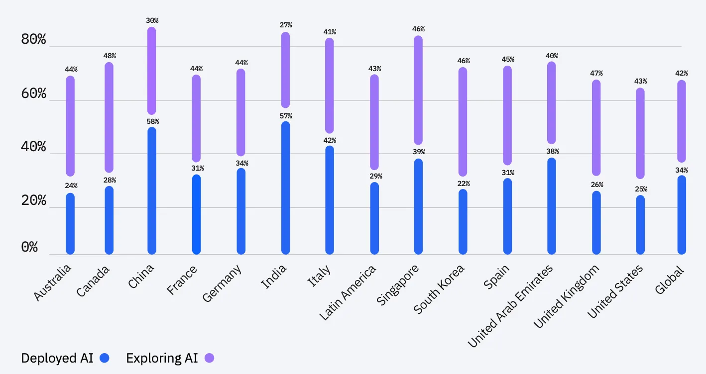 China and India have the highest AI adoption rates, 88% and 84%, respectively.