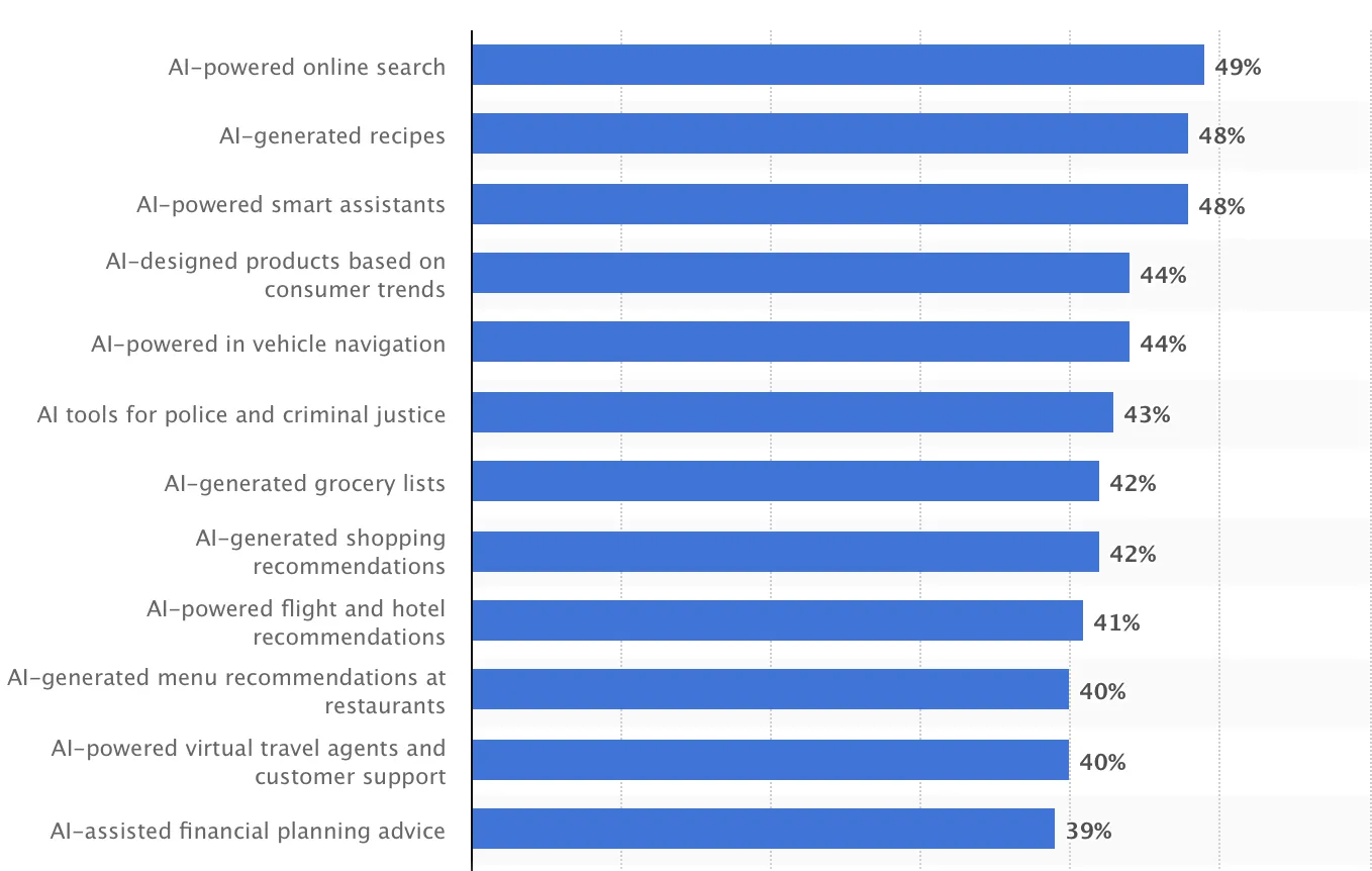 According to Statista, almost half of the adults in the United States showed interest in artificial intelligence (AI) powered online search products, among other AI-related products.
