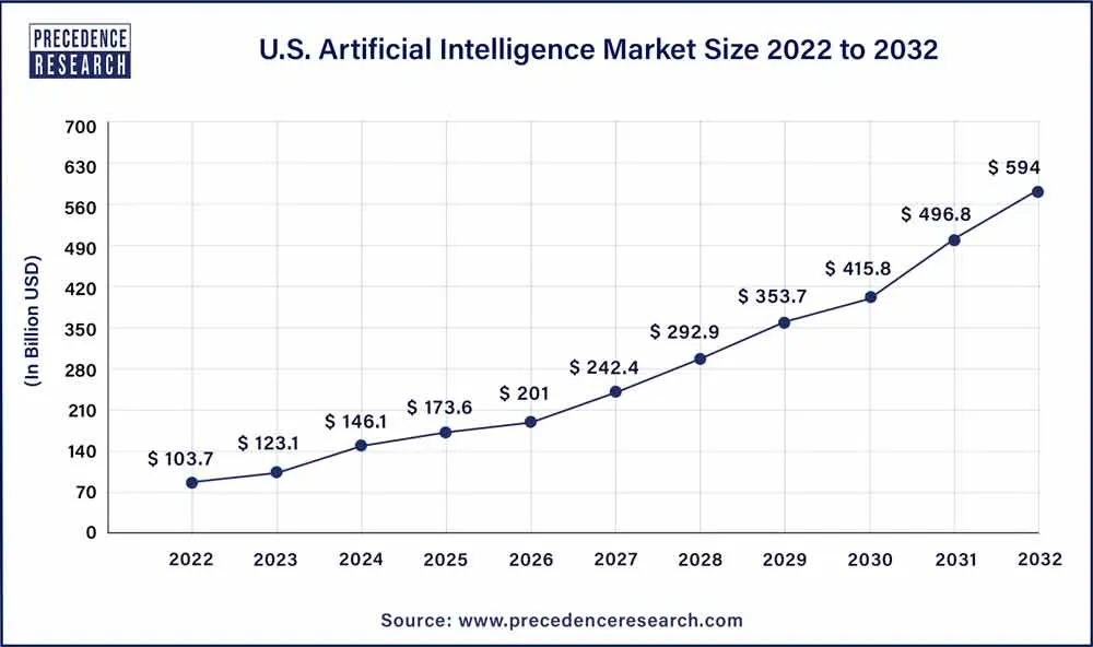 The US is the biggest AI player in the world. In 2023, the US market size accounted for 123.1 billion US dollars. It’s estimated that it will reach ~594 billion USD by 2032, growing with a Compound annual growth rate (CAGR) of 19.1%.