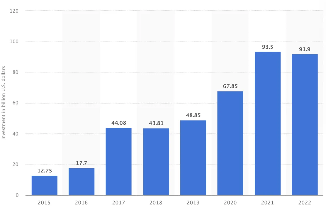 The private sector investments in AI dropped from $93.5 billion in 2021 to $91.9 billion in 2022. The United States and China are the two primary investment sources among the rest of the world countries.
