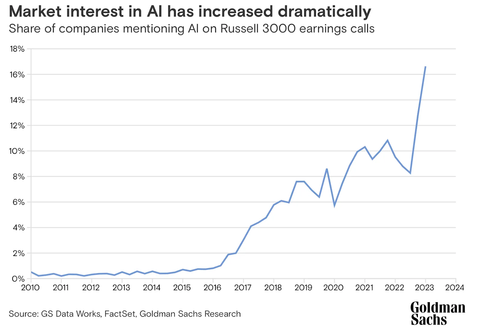 The market interest in AI has increased a lot over the years. The share of companies mentioning AI has gone up from 5.74% in 2020 to 16.63% in 2023.