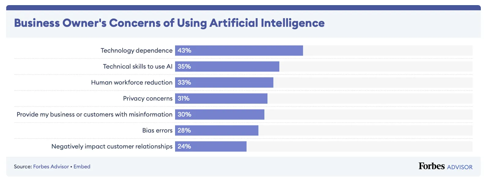 Forbes study revealed that 30% of respondents are concerned about misinformation, while 28% fear bias in AI-generated outputs.