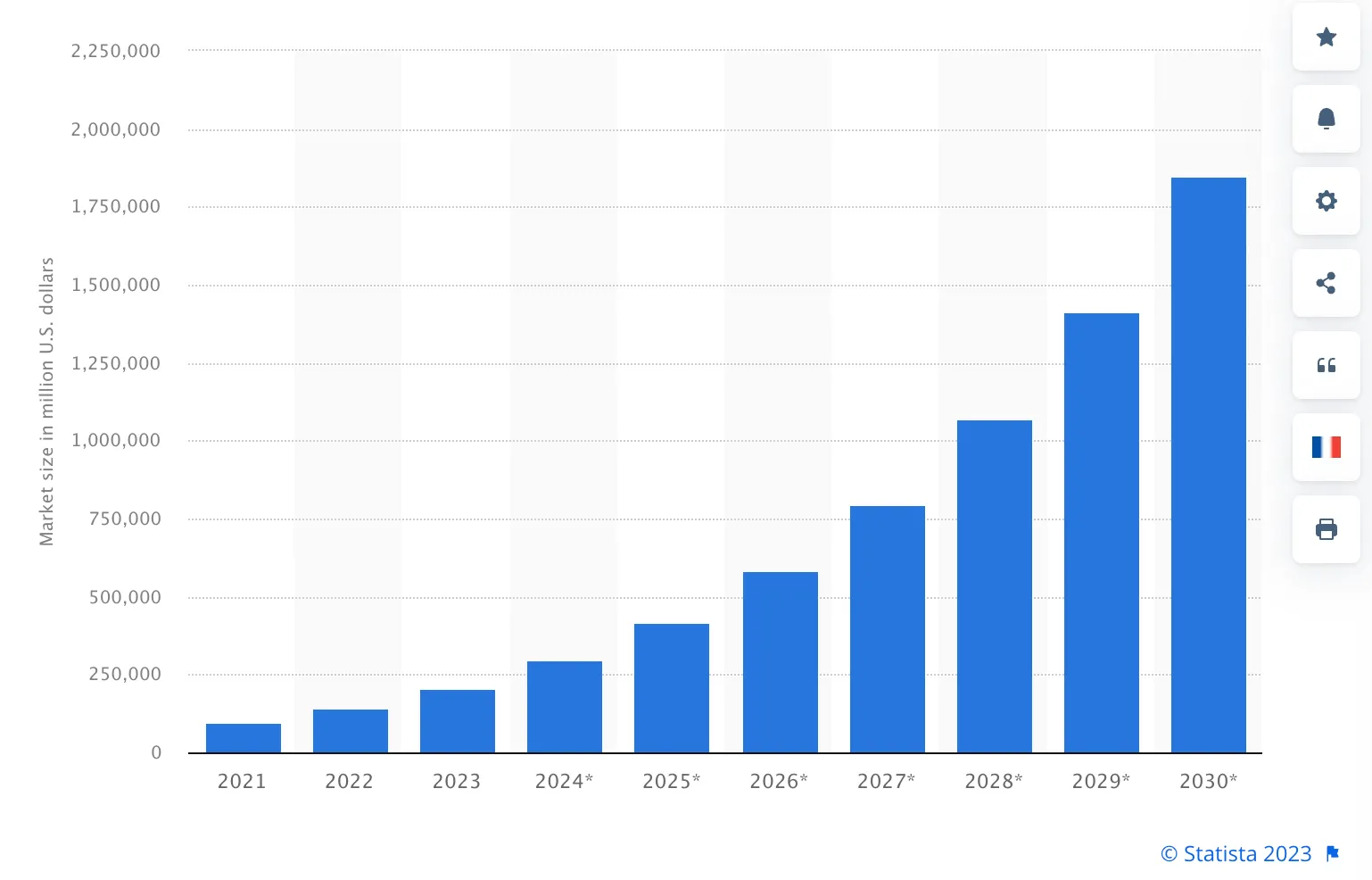 According to Statista, the AI market is expected to grow rapidly in the coming decade. Currently, the market size is ~200 billion US dollars and is expected to grow to ~2 trillion US dollars by 2030.