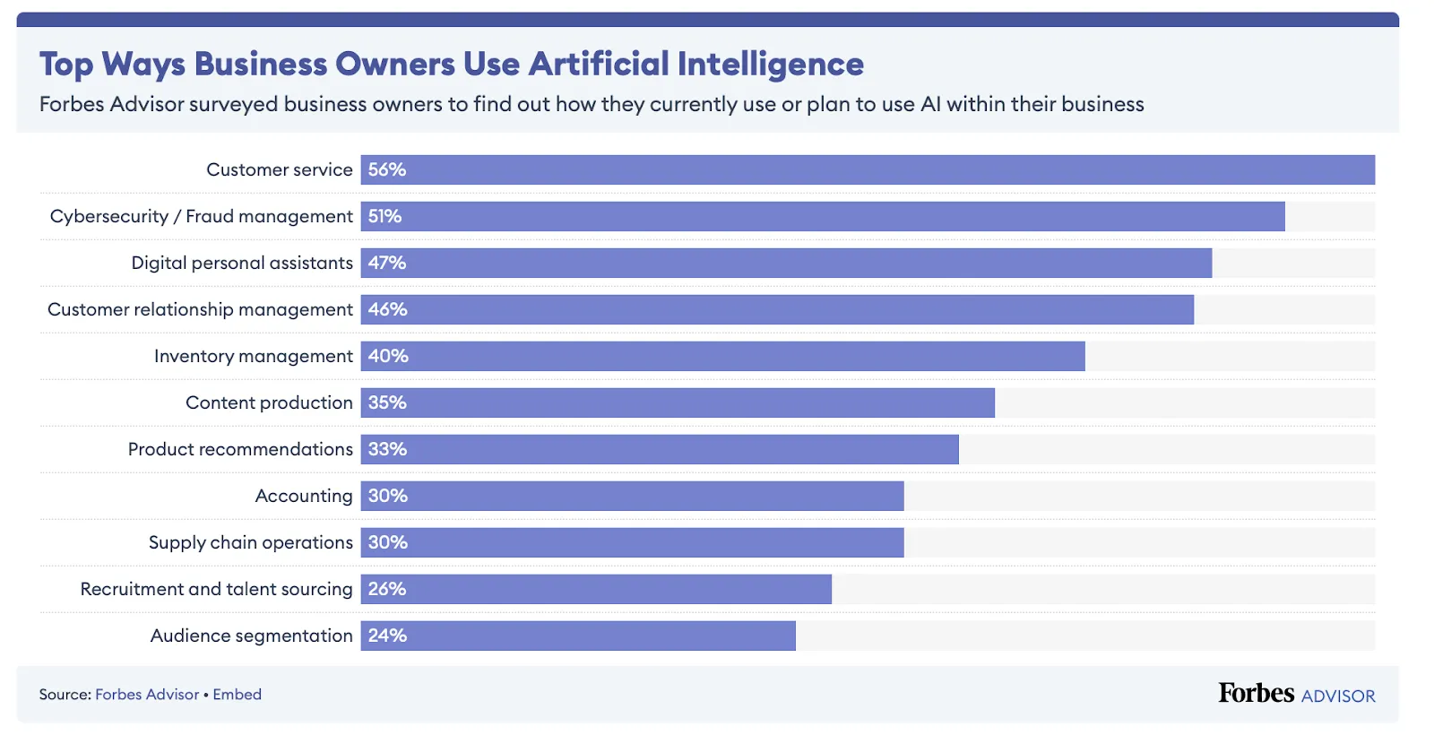 ✅ As per Forbes, businesses are using AI across a wide range of areas, with the highest adoption rate in customer service (56%) and cybersecurity (51%).