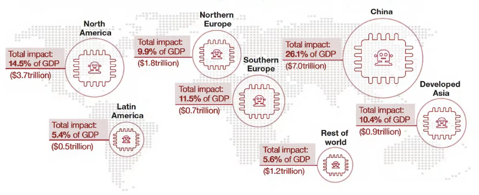 Of these $15.3 trillion, China and North America gained 70% of the global economic impact, equivalent to a total of $10.7 trillion. In comparison, the rest of the world shares the other 30% of gains.