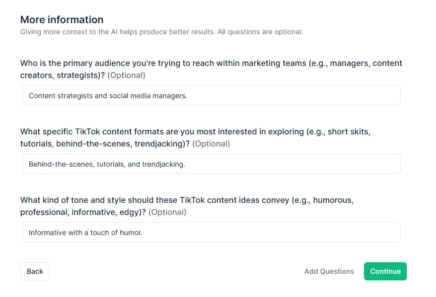 - Enter a Prompt: I type something like: “Give me 10 TikTok video ideas for a SaaS company promoting its AI content tool. Audience: marketers. Keep it fun and practical.”