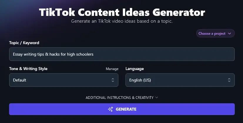 You don’t need any writing background. Just enter your topic, pick a tone or writing style, and get a list of 15 TikTok ideas in seconds. It also lets you get more detailed with custom instructions, adjust the creativity level, and even generate in 100+ languages.