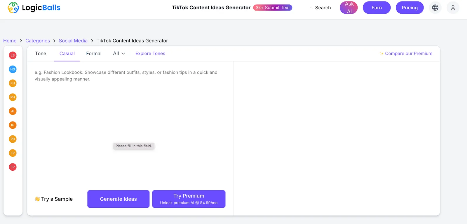 LogicBalls is one of the easiest TikTok content idea generators to get started with. It doesn’t ask you to sign up or go through a setup. You just enter your topic, pick a tone and content type, and the tool gives you a bunch of video ideas to work with.