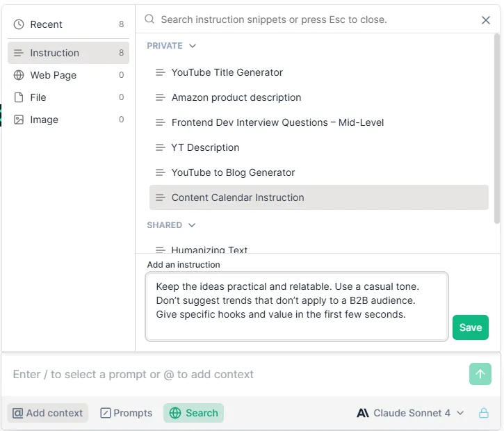 Here’s how I do it: I click “Add Context” > “Instruction” > “Add an Instruction” > “Save.” I will name it something like “TikTok ideas for B2B product launch”.