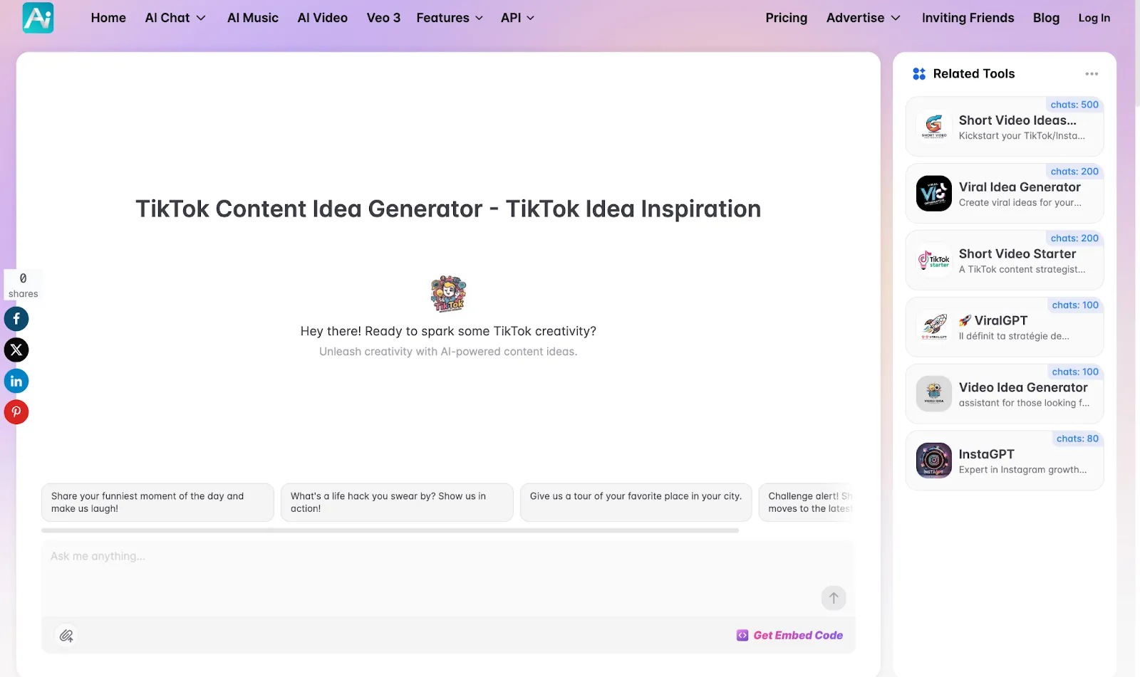 Best for: Creators, solopreneurs, and content marketers who need fast and simple TikTok video ideas.