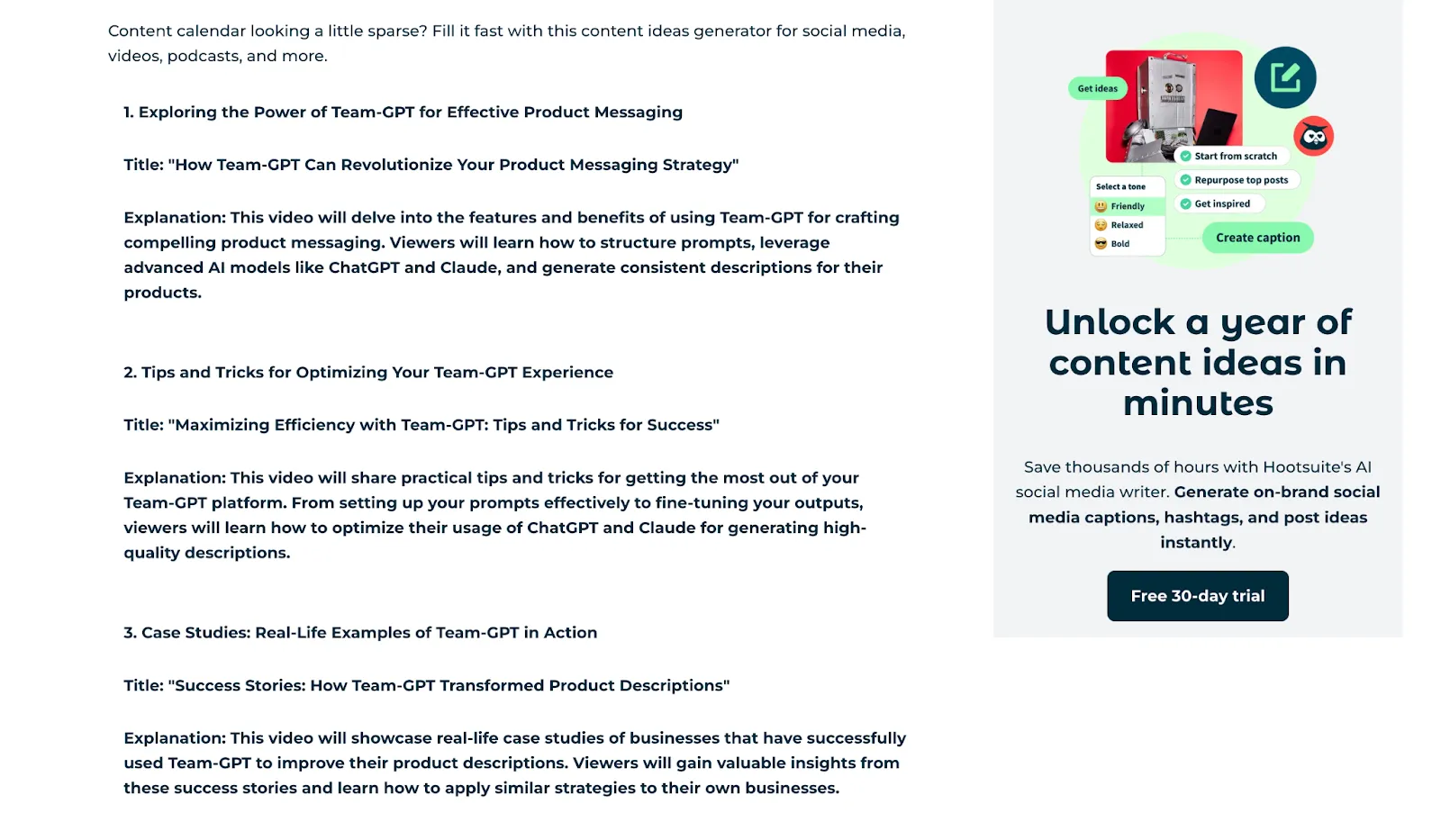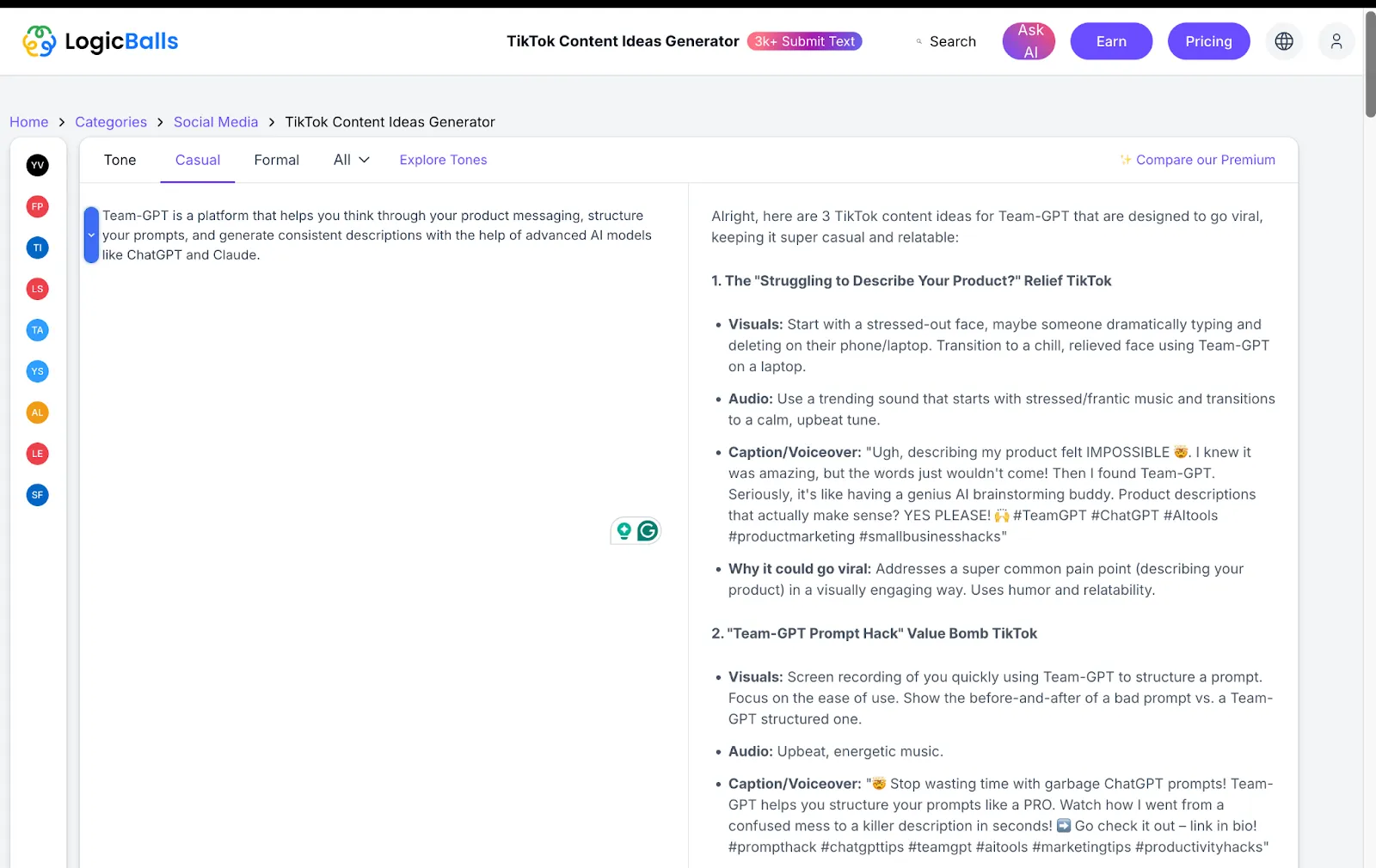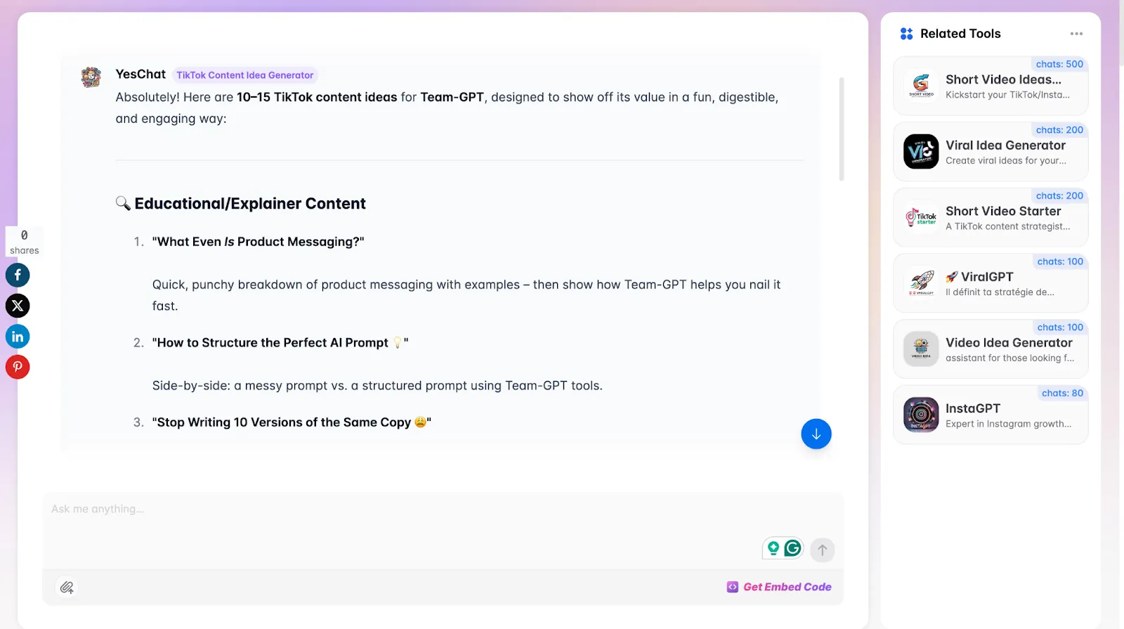 I wanted TikTok ideas to promote Team-GPT. Here’s what the tool gave me: