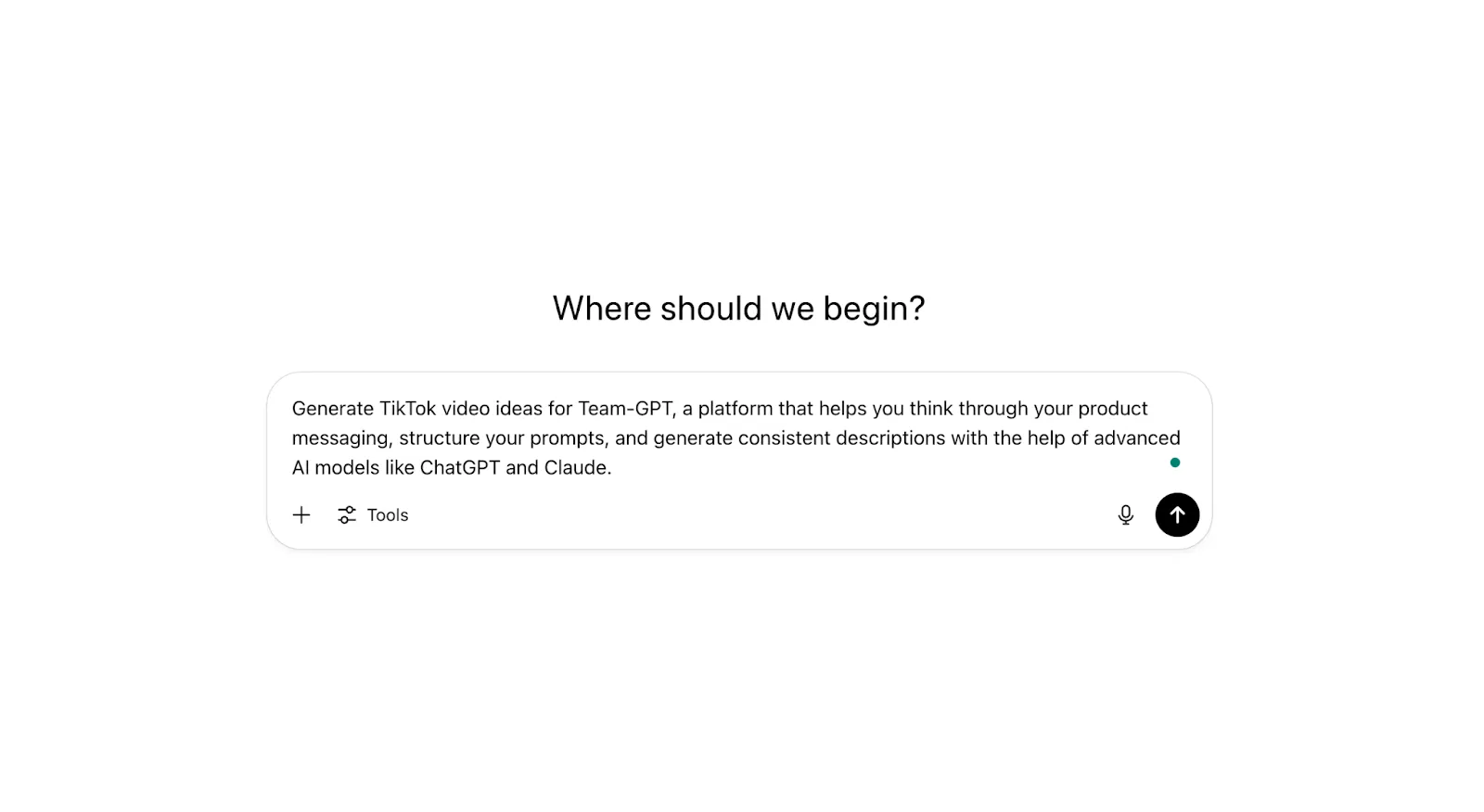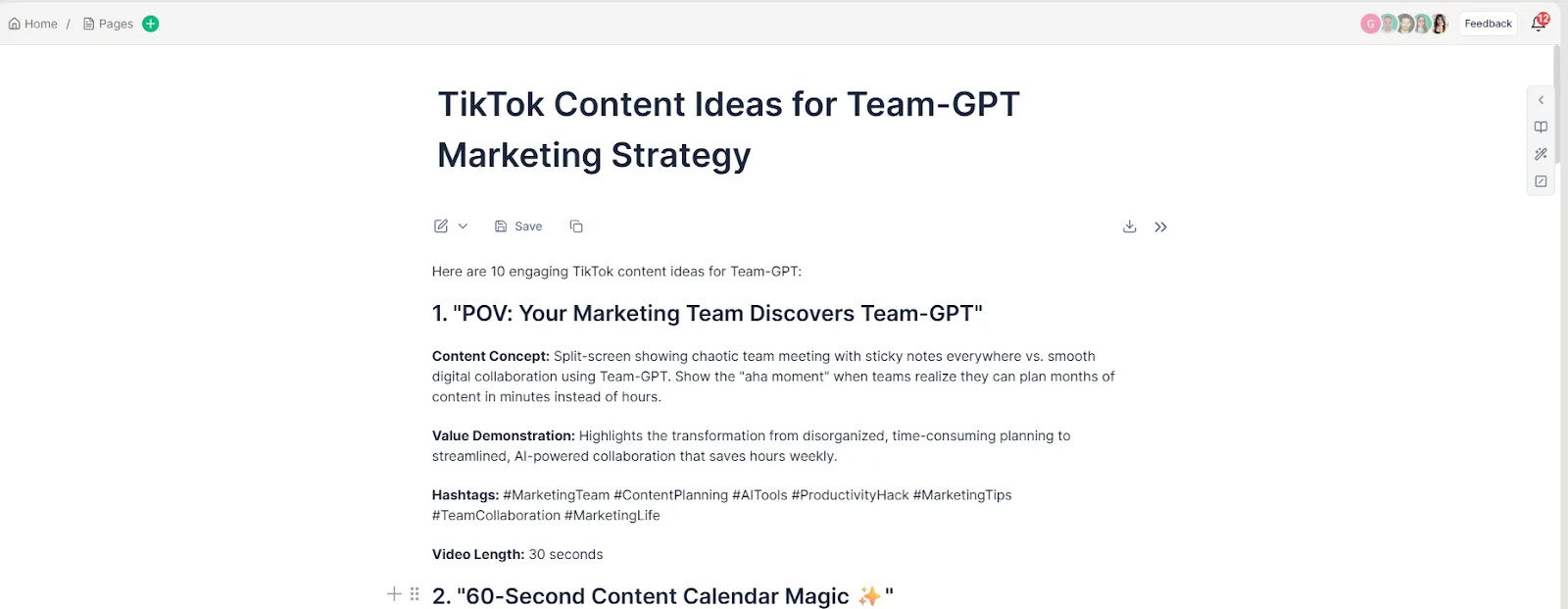 “Give me TikTok content ideas for a tool like Team-GPT. The goal is to help marketing teams understand how AI can make content planning faster and more collaborative.”