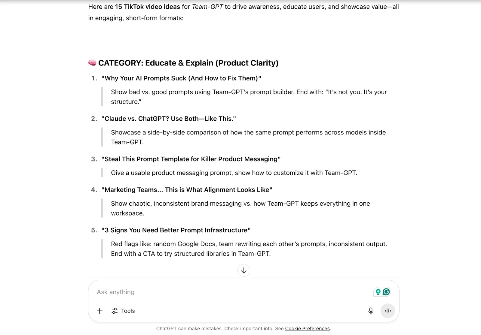 Here’s what ChatGPT gave me when I prompted it to generate 10-15 TikTok content ideas for Team-GPT.