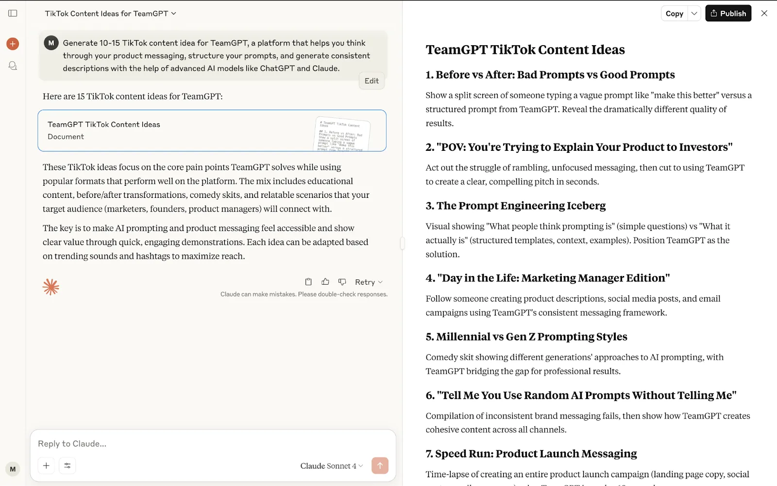 I tried generating a TikTok content idea for TeamGPT on Claude. Here’s the output: