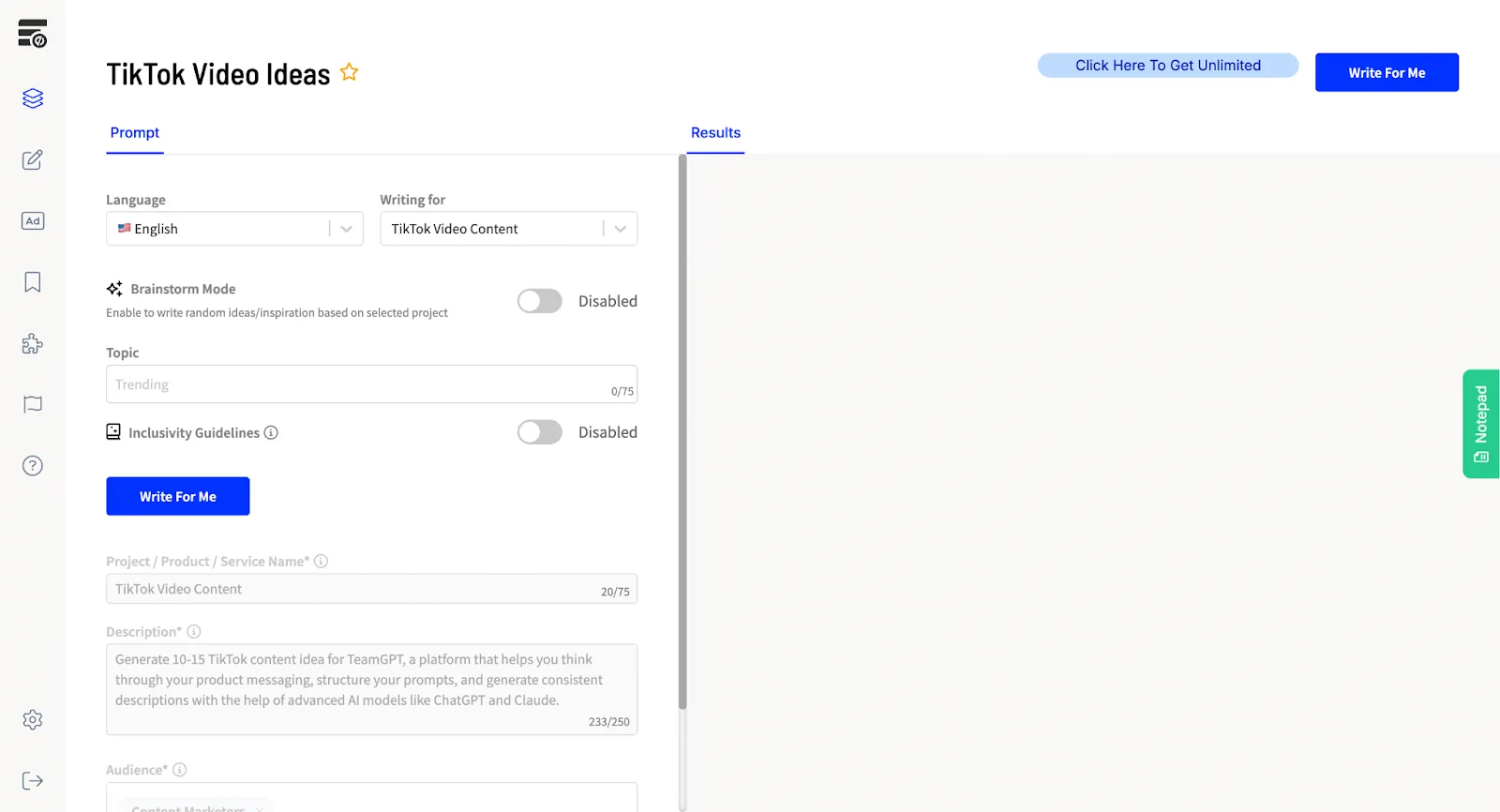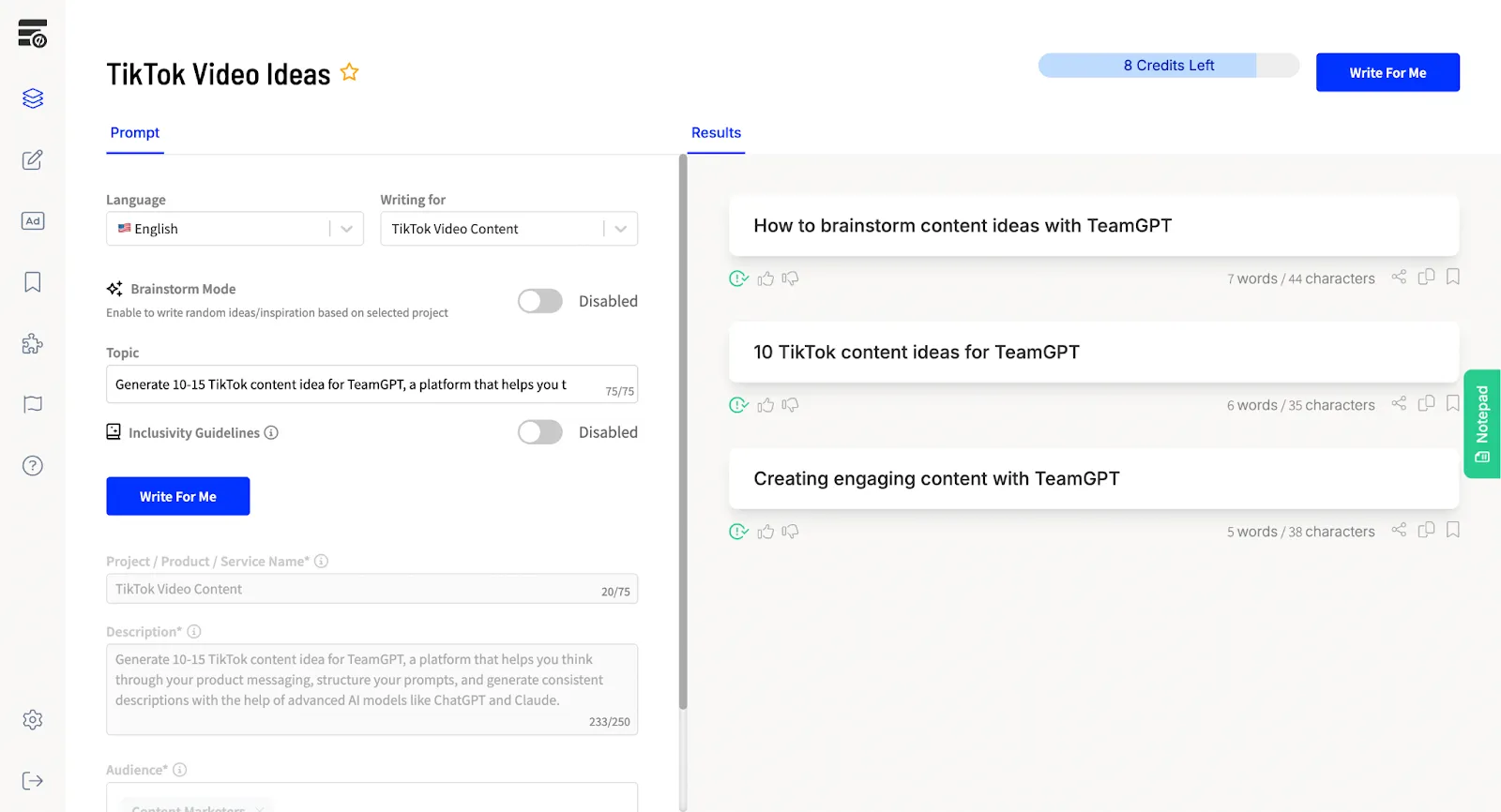 I tested RightBlogger by using it to generate TikTok content ideas for Team-GPT. Here are the results: