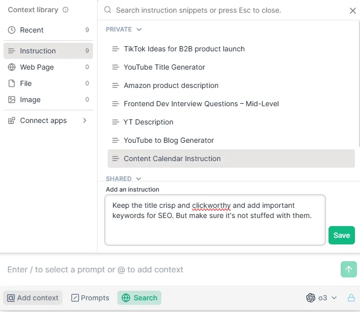 Click “Add Context” → “Instruction” → “Add an Instruction” → Name it something like “SEO Title Generation” → Hit Save.