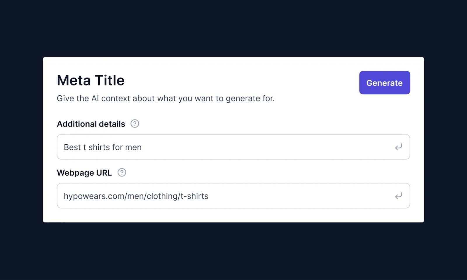 Hypotenuse AI is built for e-commerce and SEO content teams who want to create meta titles that are short, keyword-friendly, and written for clicks. While it’s mainly positioned as a meta title generator, you can use it across product pages, blogs, and content hubs where SEO-friendly titles really matter.