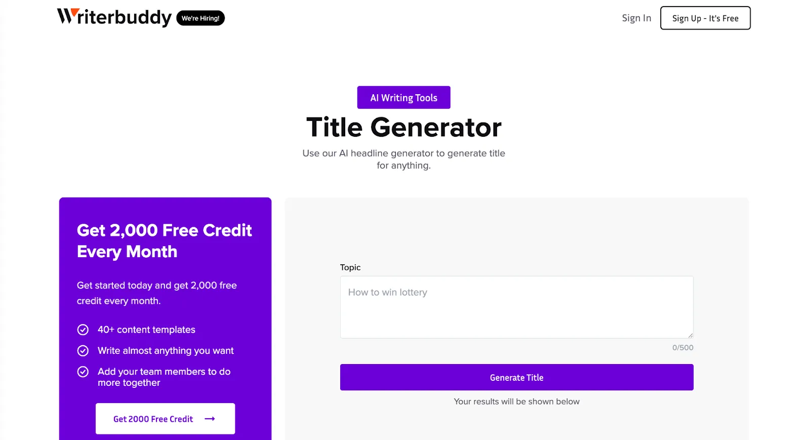 WriterBuddy is one of the simplest AI title generators you can use. It’s made for people who just want quick, clear titles without a lot of setup. You can use it for blogs, YouTube videos, press releases, essays, or anything else where you need a strong headline. All you have to do is describe your content, hit generate, and the tool gives you a few good options to pick from.