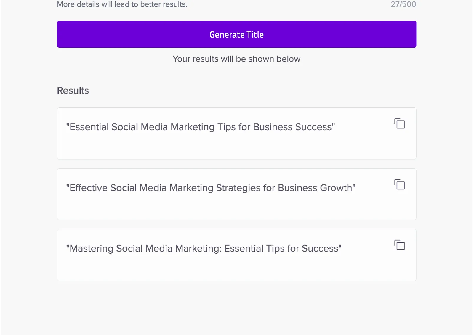 - Choose the One That Fits: Browse the titles that appear. Pick the one that fits your content tone and audience best. You can copy it directly or make small edits before publishing.