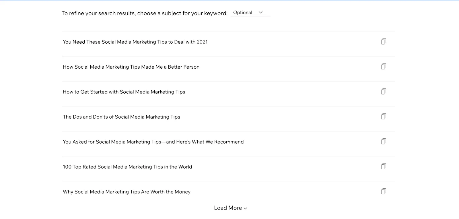 - Refine and Explore More Options: Use the subject dropdown to narrow your results and click “Load More” to see additional title ideas. Once you find one you like, copy it and use it in your content.