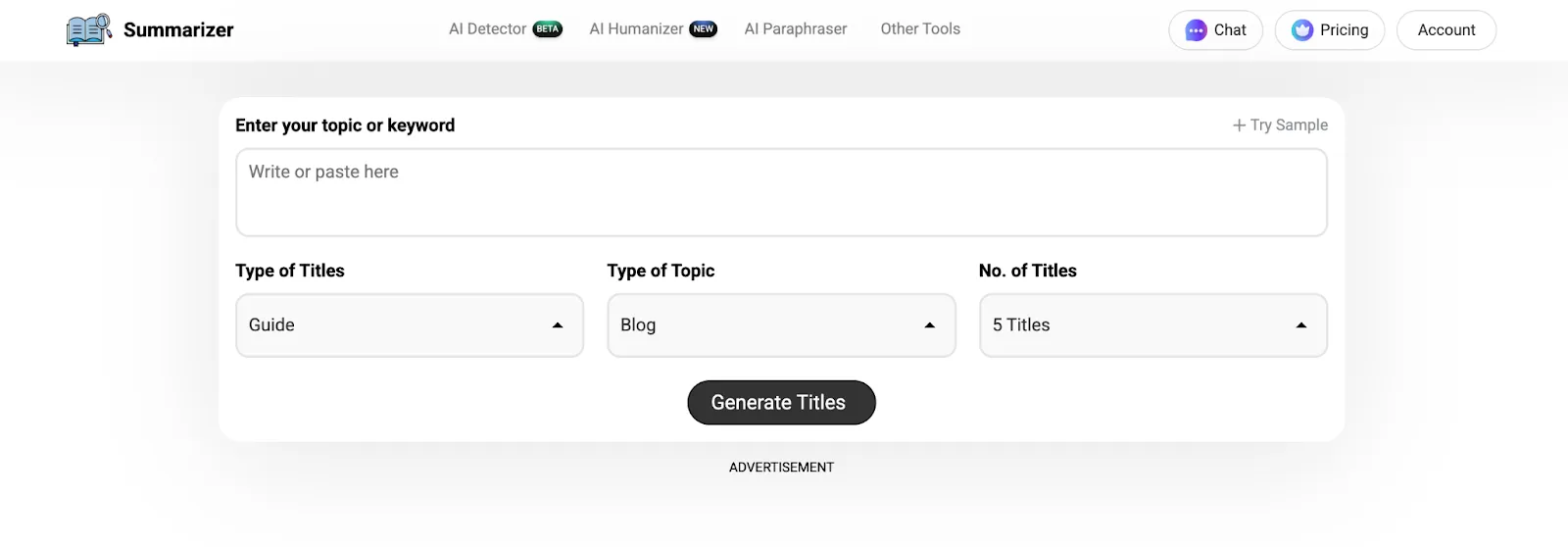 Summarizer’s AI Title Generator stands out as a comprehensive solution when you need multiple title variations quickly. You can generate up to dozens of titles in one go, with options to customize the type (guide, listicle, question, or random), topic category, and number of outputs.