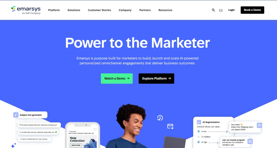 Emarsys is an omnichannel marketing and lead engagement platform that allows you to create and run elaborate campaigns across various channels, including email, SMS, website, and more.