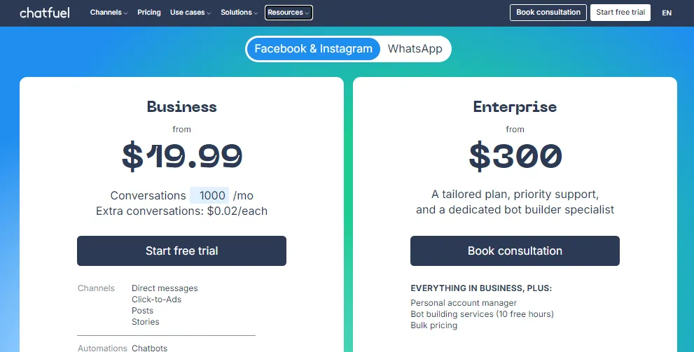 - Enterprise Plan: This plan costs $300 per month and has everything in the Business plan, plus priority support and a dedicated bot builder specialist.