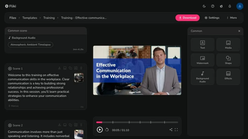 - Stock Media Integration: Automatic selection of relevant images and video clips