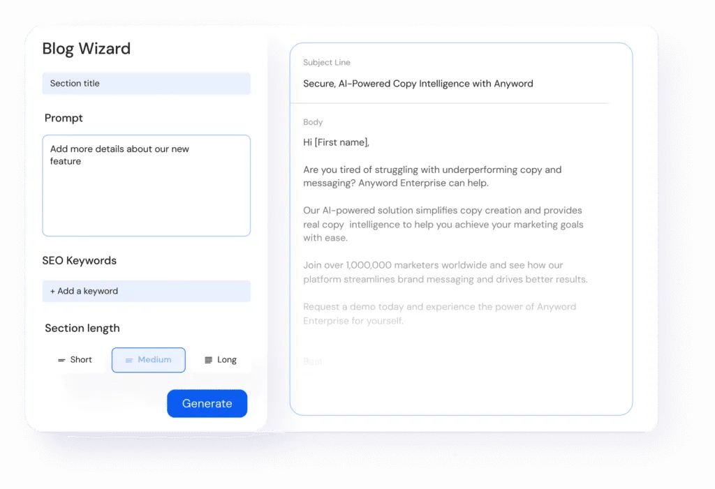Approach: Anyword differentiates itself by focusing on performance prediction rather than just content generation. The platform analyzes patterns from previous campaigns to suggest which content versions might perform better.