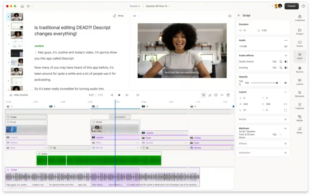 Descript approaches video editing through transcript manipulation, making video editing more accessible to non-editors.