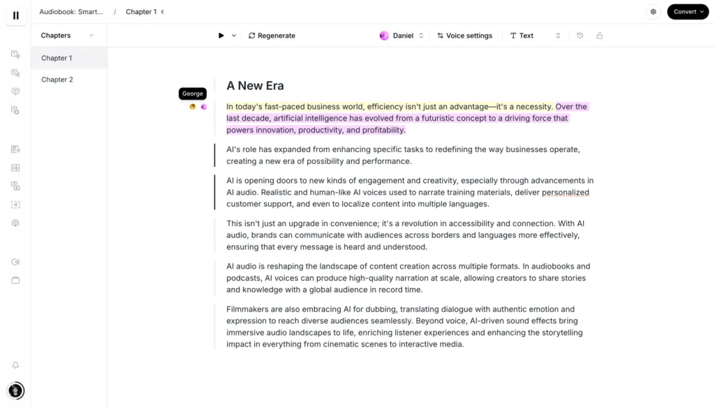 Best Applications: Voiceovers for videos, podcast intro/outros, audiobook narration, and prototype voice applications. Less suitable for highly emotional content.