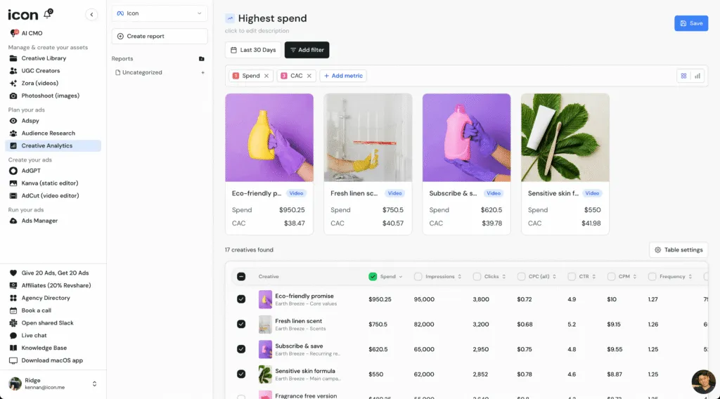 - AI Ad Creation: Generate video ads, static ads, and UGC content automatically