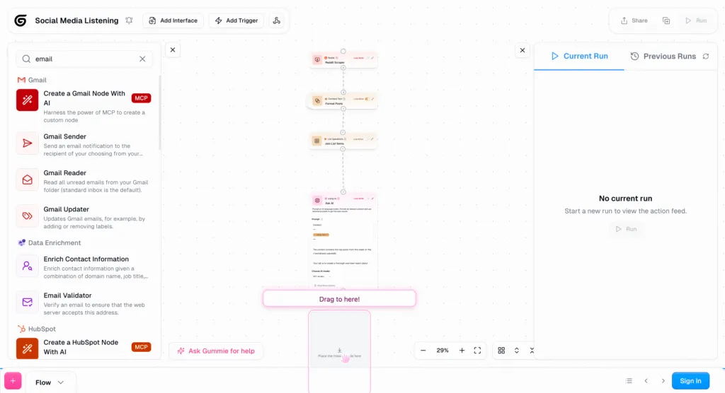 Gumloop is a no-code automation platform that lets you build sophisticated AI-powered workflows using a visual drag-and-drop interface.