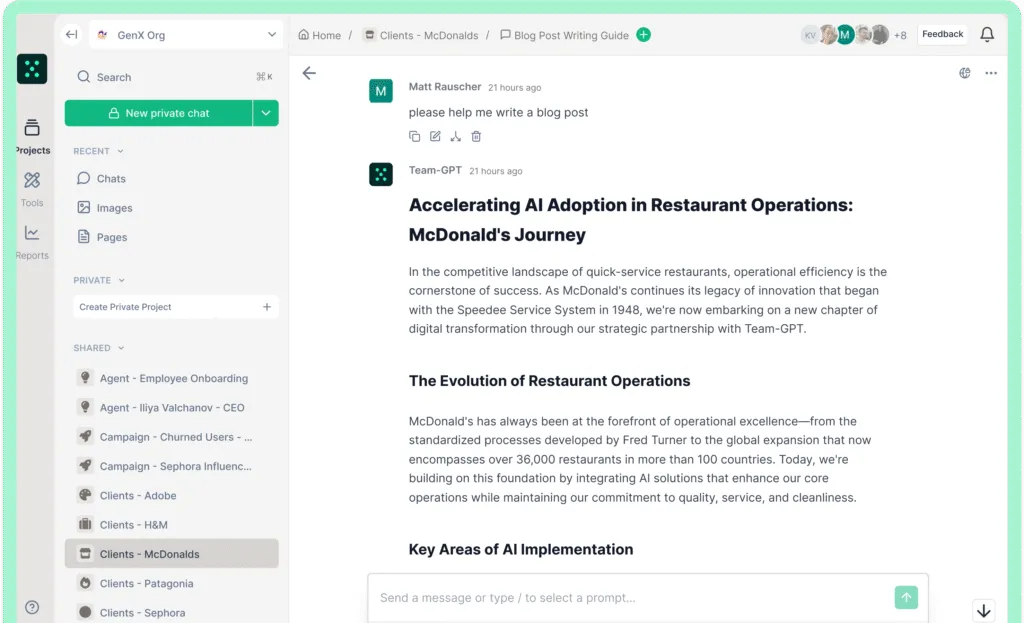 The platform solves the exact problems I see marketing teams struggling with every day. When team members use individual AI tools, you get inconsistent brand voice, scattered prompts, and multiplied costs. Team-GPT centralizes AI access while providing the marketing-specific features that make AI truly productive for teams.