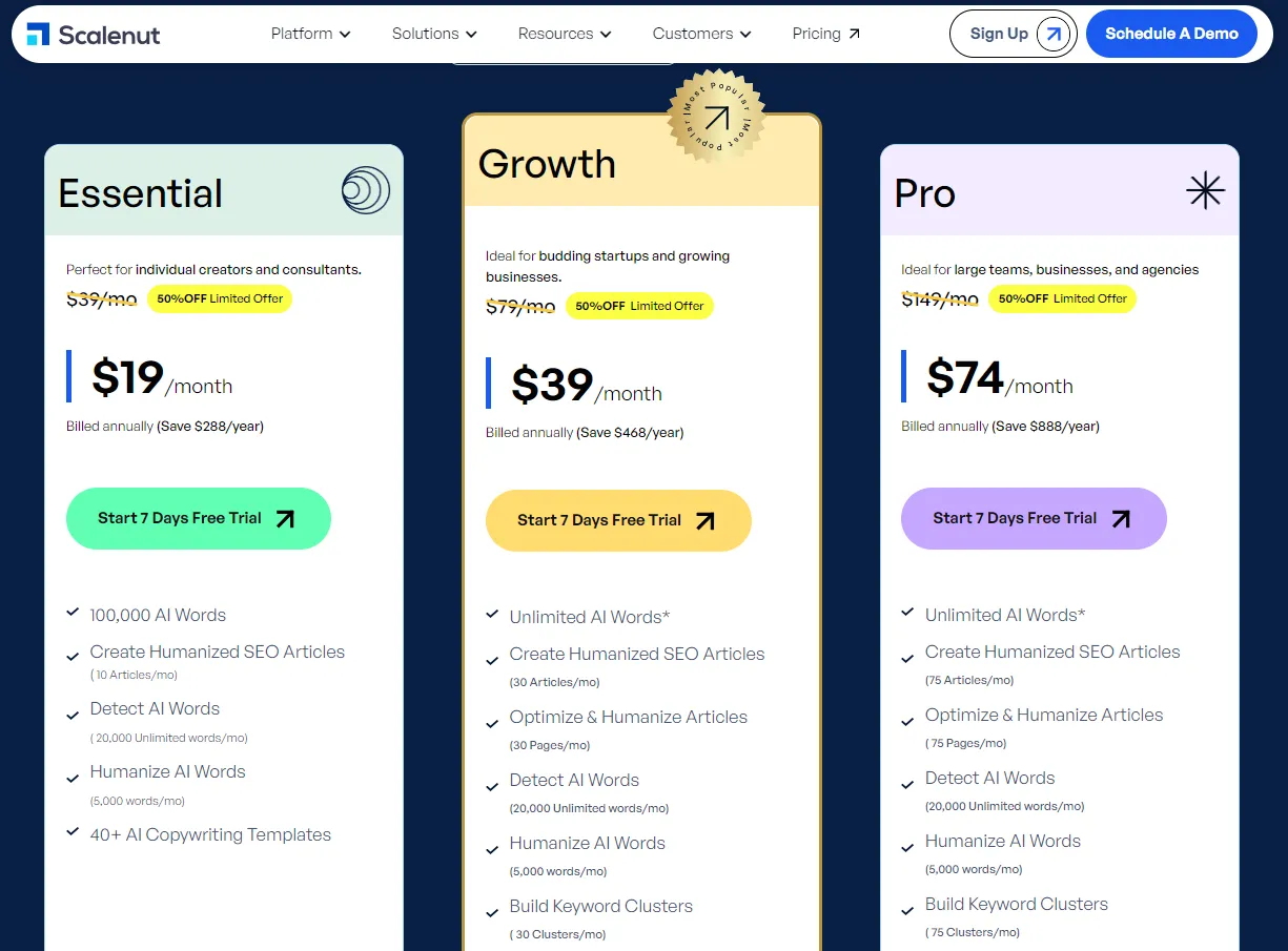 - Pro Plan: $74/month when billed annually, giving you access to 75 optimized and humanized AI articles a month, 75 clusters a month, and 500 pages to analyze monthly from 5 domains.