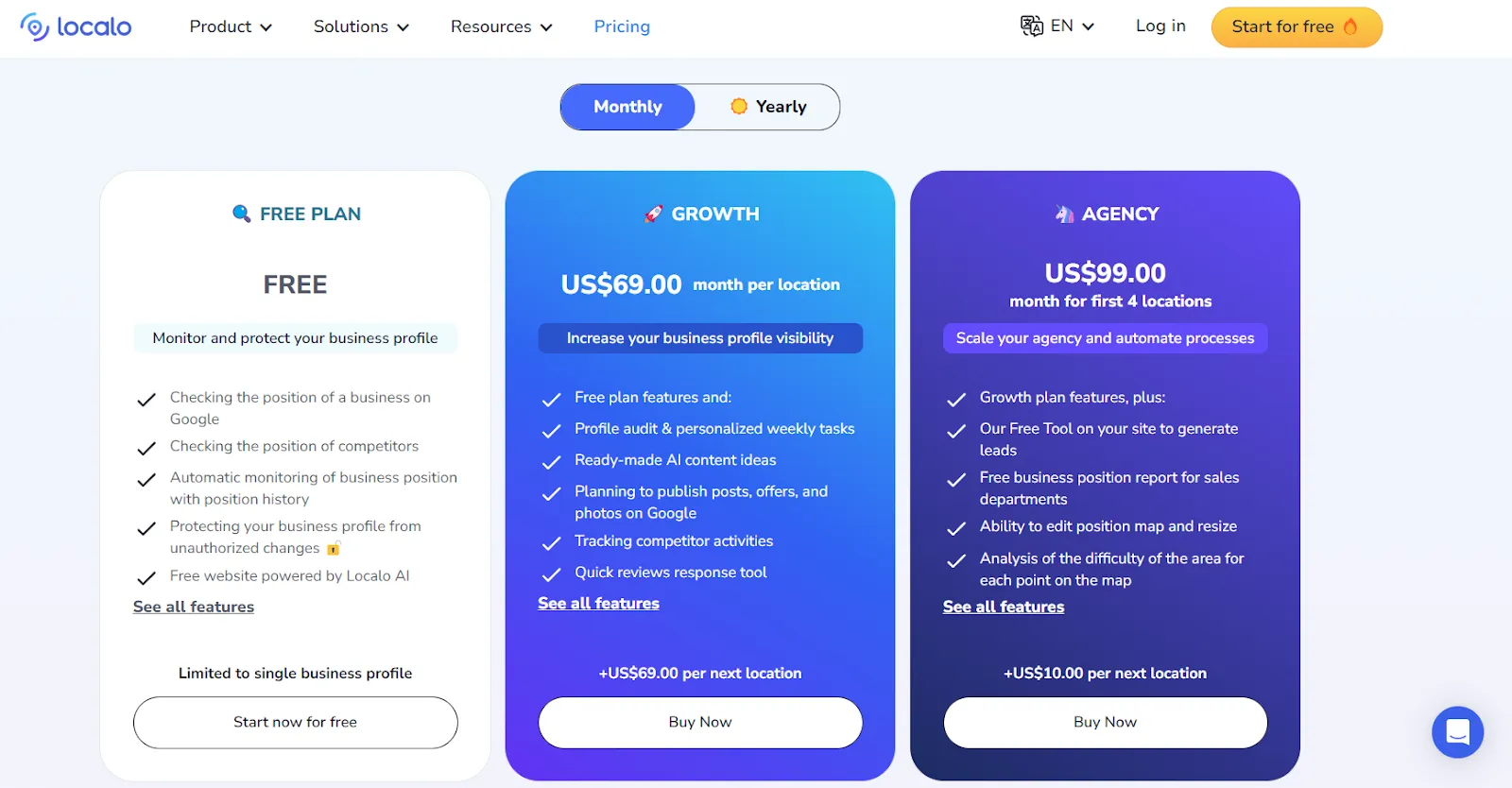 - Growth Plan: $69/month per location, which gives you access to profile audits and personalized weekly tasks, AI content ideas, and competitor activity tracking.