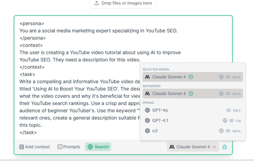 The best tools I’ve used either require detailed context (such as my script, topic, or audience) or allow me to link the video. That way, the output doesn’t just repeat the title, it explains the value of watching the video in 2–3 lines.