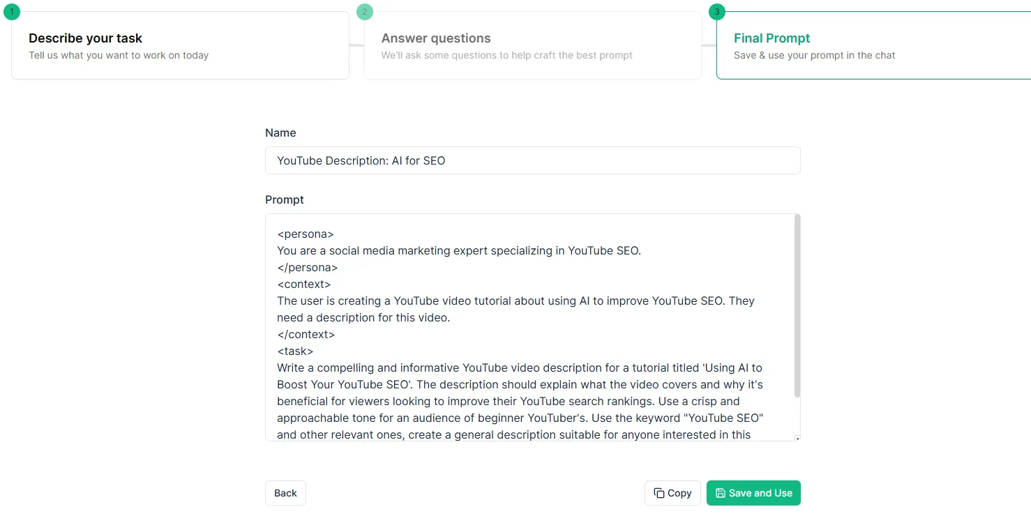After I’ve filled in everything, I click “Continue” and I get a structured prompt with clear sections: persona, context, and task. I can preview the full prompt and make any necessary edits in this step, and then hit “Save & Use”.