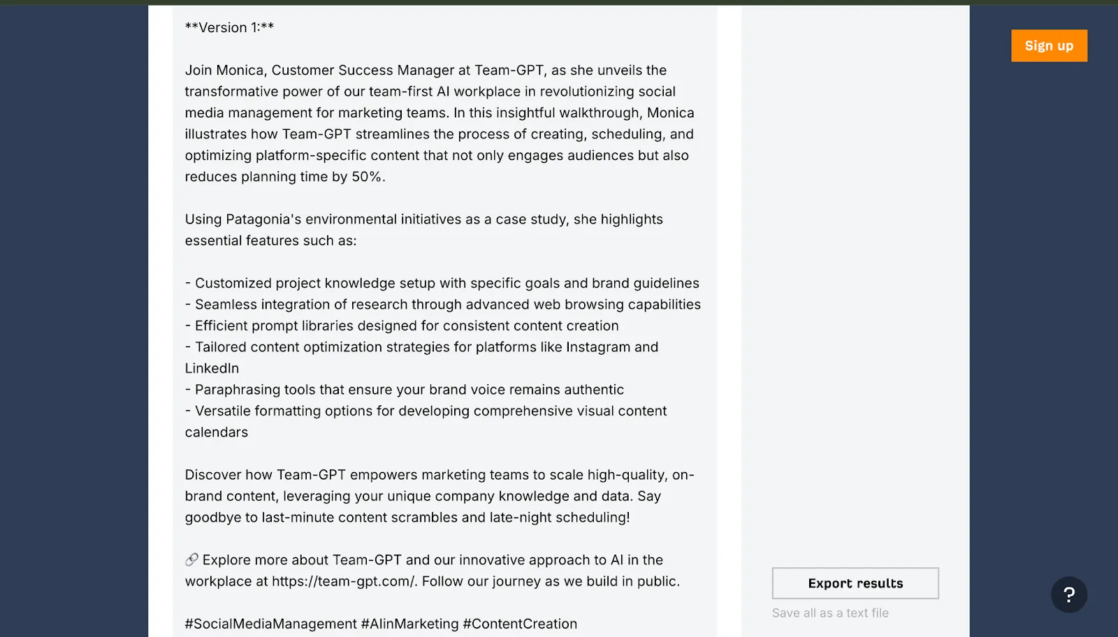 Here’s what RightBlogger generated when I prompted it to create a YouTube description for the Team-GPT video titled “How Team-GPT Cuts Social Media Planning Time in Half.”